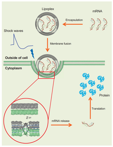 In this study, mRNA carrying lipid nanoparticles were designed to have two particular properties. (1) Two different degrees of freedom that allowed them to contort and fuse efficiently with a variety of different cancer cell lines. (2) Highly compliant acoustic properties so that an external acoustic field can easily deform the nanoparticles along the two degrees of freedom. Thus exposing these lipid nanoparticles to acoustic impulses as they interacted with several cancer cell lines led a further significant increase in the mRNA translation. This study was a milestone in a concerted effort towards utilizing shock waves in macrodrugs delivery that started with systematic biophysical studies on how shockwaves interact with lipid nanoparticles. These results were published previously and showed that shockwaves could change the properties of lipid nanoparticles dynamically by changing their conformational state. In two different papers priors to this, we showed that shock waves could change the properties of lipid nanoparticles either via radiation force or cavitation.