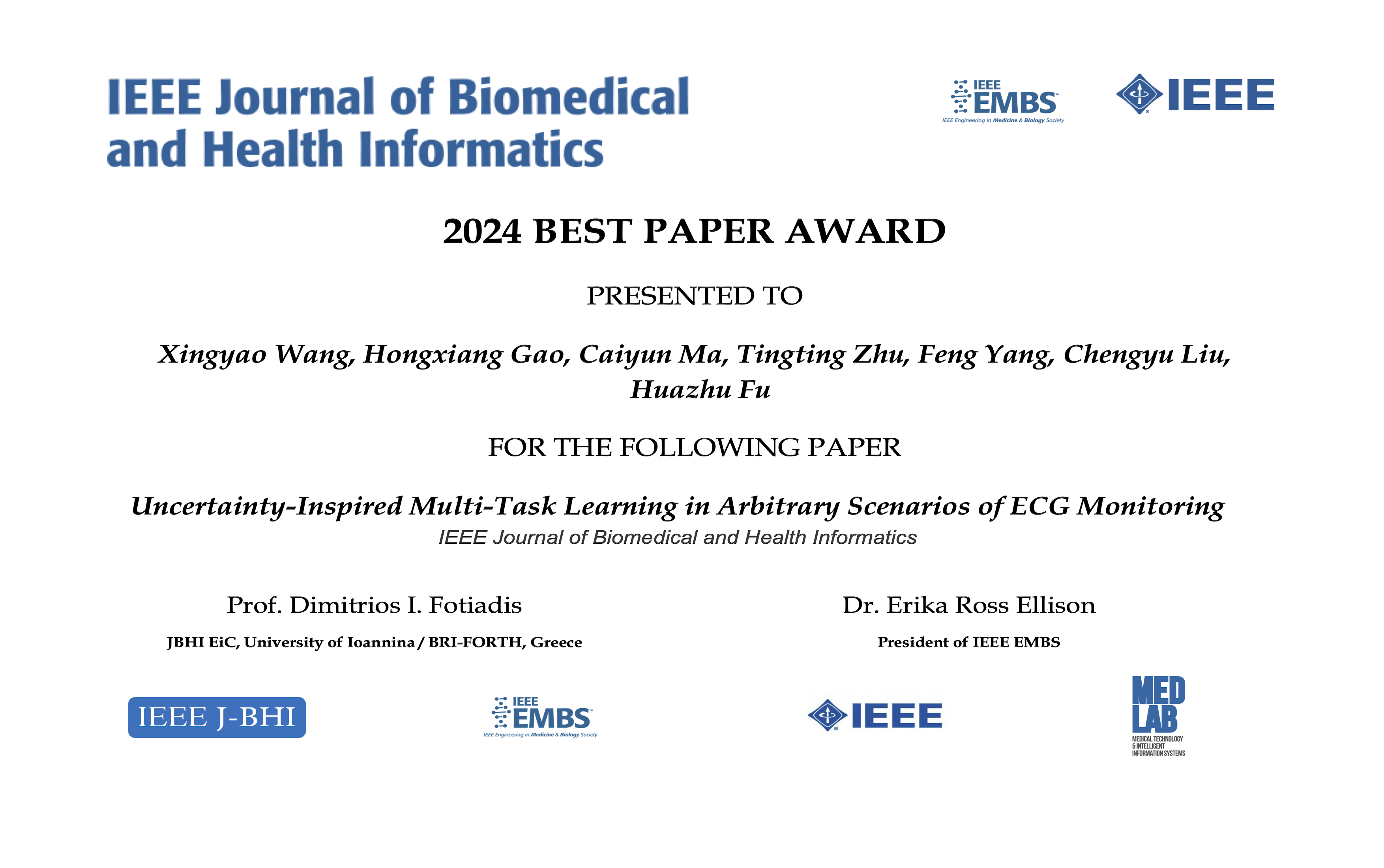 We are delighted to announce that the paper “Uncertainty-Inspired Multi-Task Learning in Arbitrary Scenarios of ECG Monitoring” has received the Best Paper Award from the IEEE Journal of Biomedical and Health Informatics (JBHI). The award recognises outstanding contributions to the advancement of biomedical and health informatics research, highlighting the paper’s innovation and impact in the field of intelligent cardiovascular monitoring.