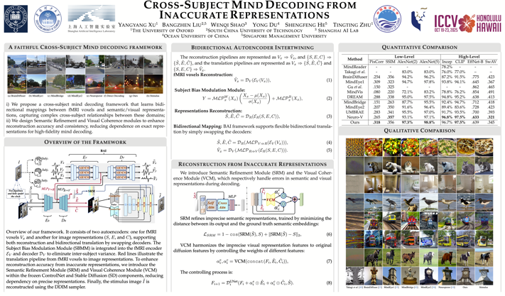 Yangyang’s paper, titled “Cross-Subject Mind Decoding from Inaccurate Representations”, introduces the Bidirectional Autoencoder Intertwining (BAI) framework. This novel approach leverages fMRI signals from individuals to reconstruct real-world images they have visualised, effectively addressing traditional challenges such as inter-subject variability and error accumulation. By unifying subject data and refining representations, the BAI framework achieves state-of-the-art performance, high-fidelity reconstructions, and adapts to new subjects with minimal data. For more details, please refer to the paper.