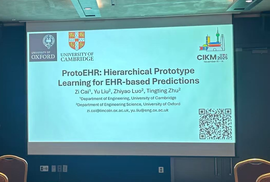 On 14 November 2025, Zi Cai presented his work “ProtoEHR: An Interpretable Framework for Hierarchical Healthcare Predictions” at the ACM International Conference on Information and Knowledge Management (CIKM 2025), held in Seoul, South Korea. CIKM is one of the leading international forums for research in information retrieval, data management, and knowledge-based systems, bringing together experts from academia and industry to discuss advances in artificial intelligence and data science.