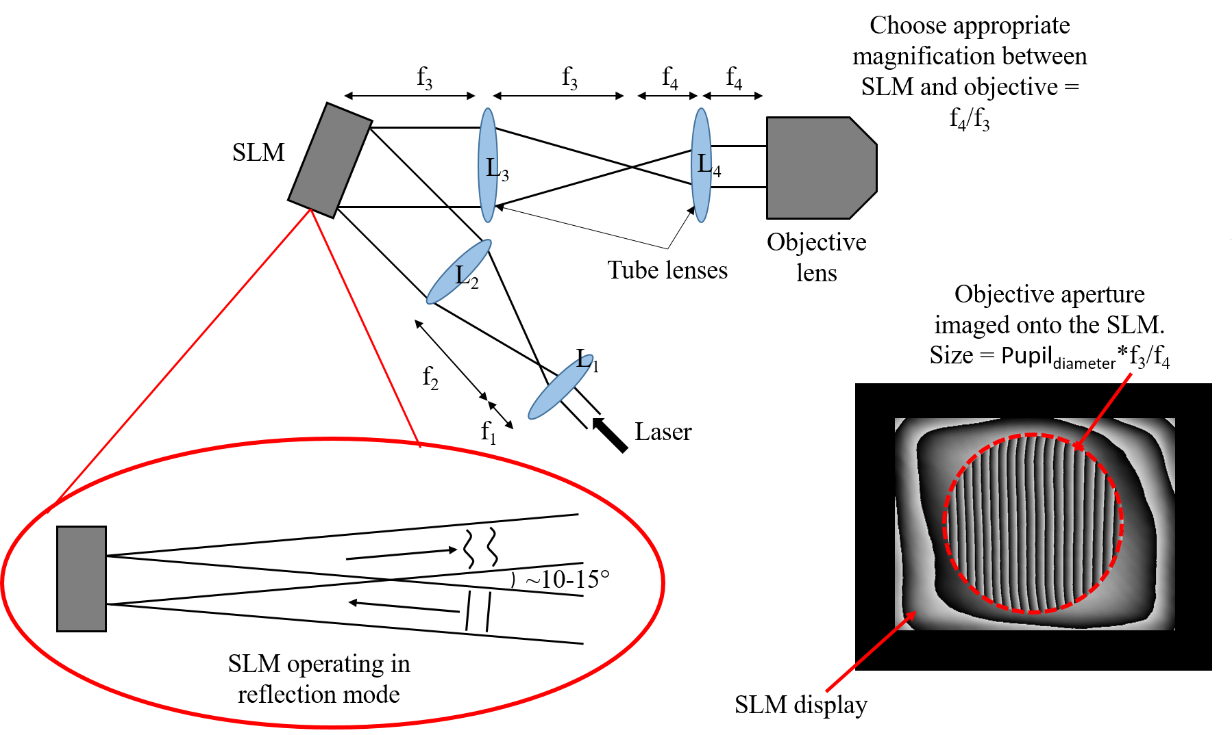 - By choosing different focal length lenses in the 4f configuration, it is possible to magnify/demagnify the SLM relative to the objective.