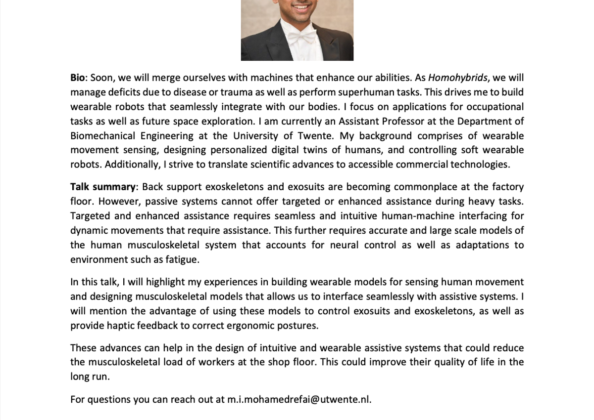 The second seminar hosted an external speaker Dr Mohamed Irfan Refai from the University of Twente and our very own HBL member Dr Ryman Hashem. Focusing on the topic of soft robots for healthcare, Dr Refai and Dr Hashem shared their unique experience and insight into human-exosuit as well as robots for medical interventions and surgical training.