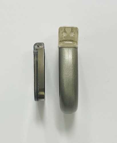 Side view of the Picostim™ miniaturised skull-mounted device, left, compared to a conventional chest-mounted device, right