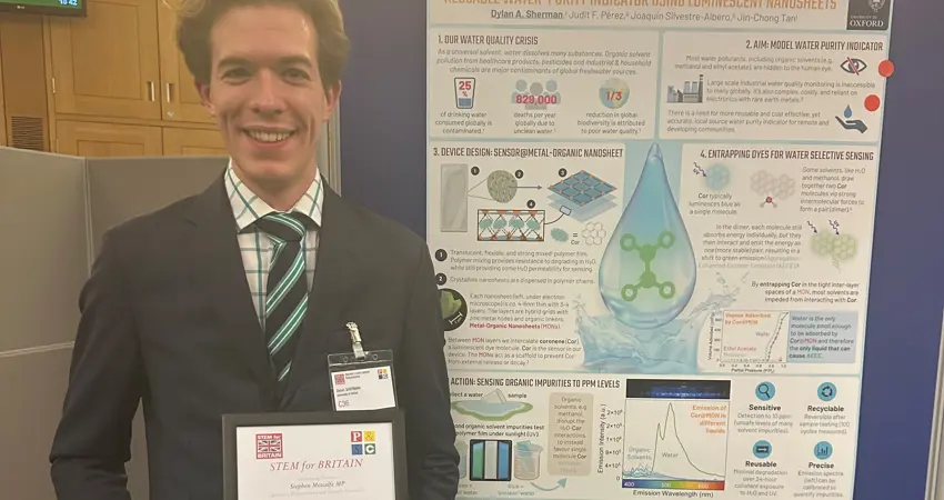 120 shortlisted finalists were invited to the reception event at UK Parliament to present a scientific poster. Reflecting on the event, Dylan says, "It was an electric atmosphere, stimulated by the nexus between politicians, industry, professional organisations and academics. Even better, the poster format meant the connection between sectors was real - easily enabling powerful one-to-one discussions with parliamentarians and professionals directly. Sharing my research with the broader community was an exciting challenge of simplification and relatability - distilling the work to what really matters for our society. Thank you to all involved for the opportunity!" Dylan is supervised by Professor Jin-Chong Tan in the Multifunctional Materials & Composites Lab.