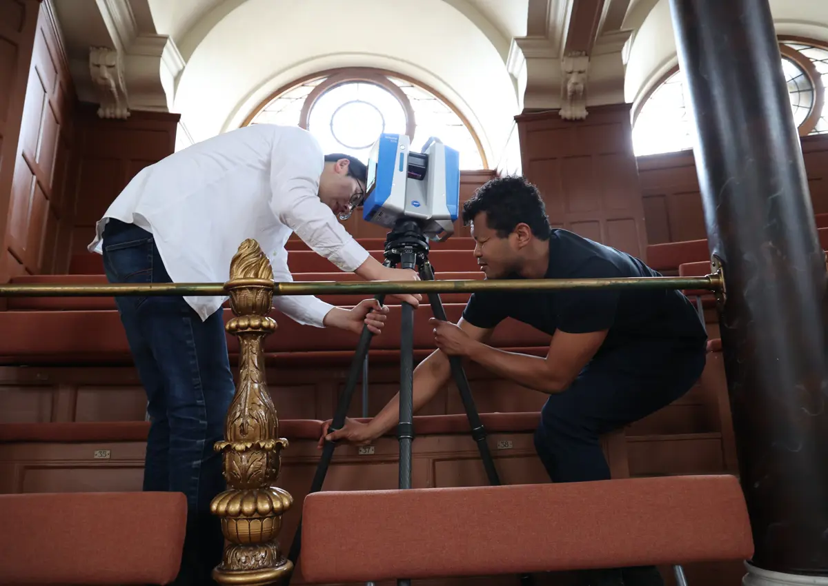 To test the capabilities of their novel SLAM algorithms, the team partnered with the operations team for the Sheldonian Theatre: a six-floor, Grade I listed building that is the official ceremonial hall of the University of Oxford. First, the team produced a high-resolution map using a standard survey-grade 3D laser scanner, mounted on a tripod and weighing ten kilograms.