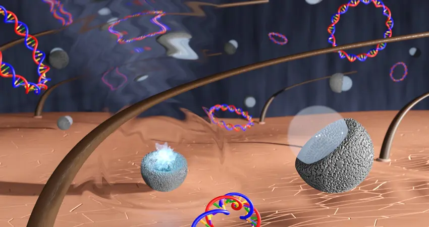 An illustration by Darcy Dunn-Lawless of the needle-free vaccination process, showing a mixture of vaccine molecules (rings of DNA) and bubbles applied to the surface of the skin. The bubbles are supported by novel cup-shaped particles made of protein. When exposed to ultrasound waves from a sound source placed over the skin, these bubbles cavitate violently and force the vaccine molecules into the skin