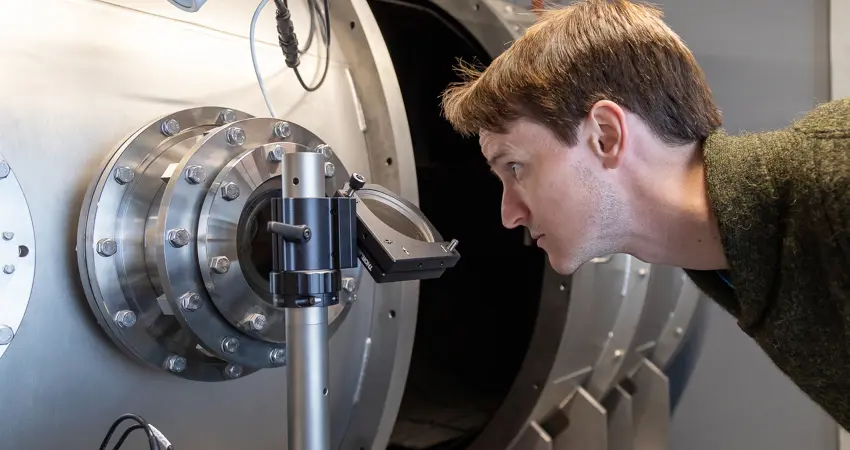 Co-founder and CEO Dr Nick Hawker inspects optical diagnostic equipment attached to the target containment vessel