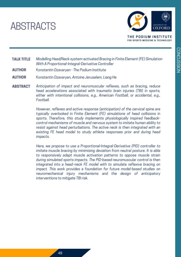 K. Dzavaryan, A. Jérusalem and L. He. Digital twins for impact reconstruction and TBI in sports. Annual Conference on Sports Medicine & Technology 2025, Oxford, United Kingdom (2025)