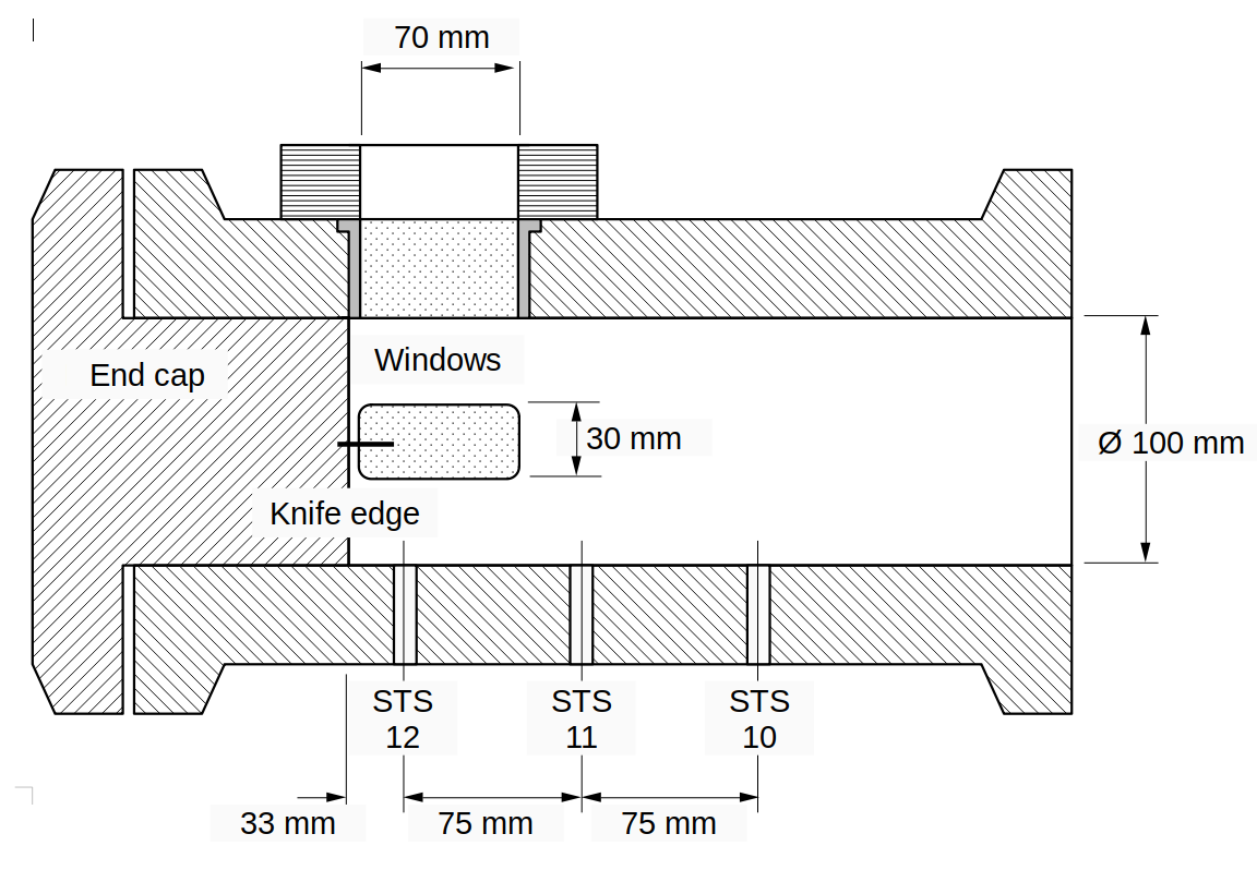 The CDST's optical test section has been designed with maximum flexibility in mind. Three, flush fitted, orthogonal 70 x 30 mm fused silica windows allow the application of a variety of, typically laser based, visualization and measurement techniques. End caps are changed to suit the experiment, typically accommodating an axially located fuel injector (a simple knife edge arrangement used for powder dispersion is shown in the illustration to the right, STS indicates the position of high-speed pressure sensors).