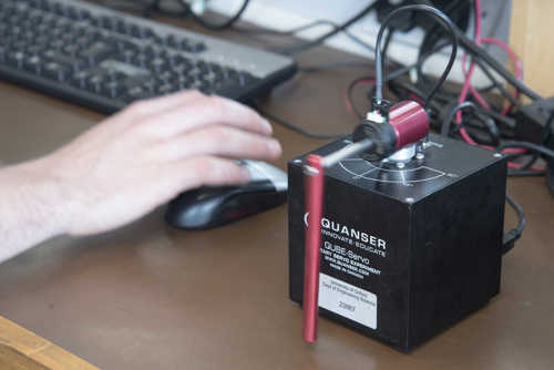 This inverted pendulum may be small, but it is usually people's favourite piece of hardware. When in action, the controller uses the information from the motor encoder to self-correct and keep the pendulum upright. It even has the ability to swing up from completely vertical. This equipment has been used by 4th year project students and Control researchers. A similar piece of equipment is the rotary inverted pendulum.