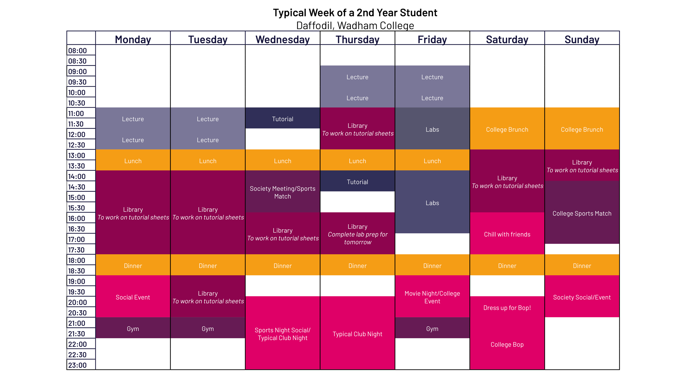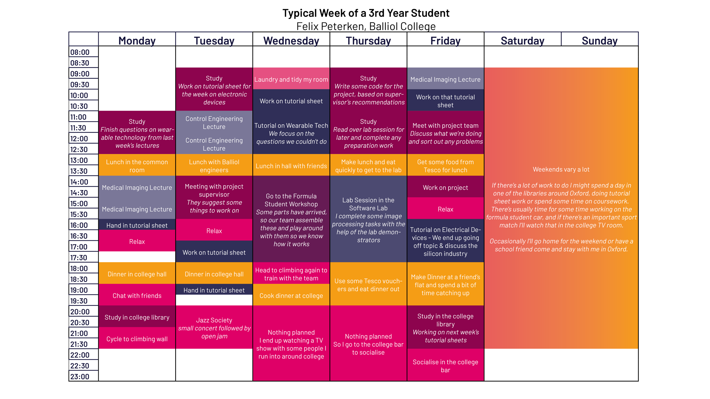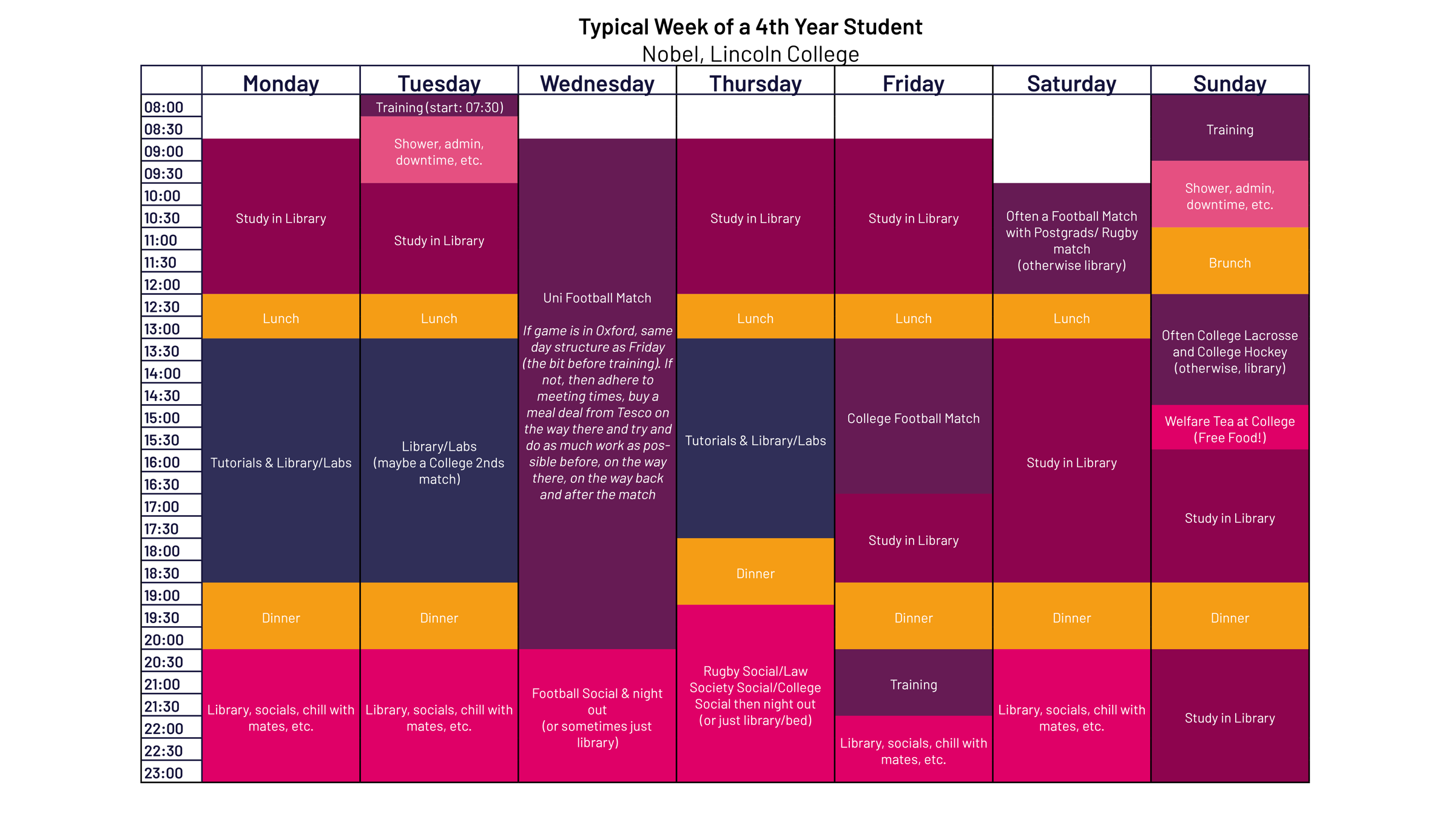 Timetables vary quite significantly from year to year. You'll find some example timetables from real students in different years here so you can see what your day might look like when you are studying Engineering at Oxford.